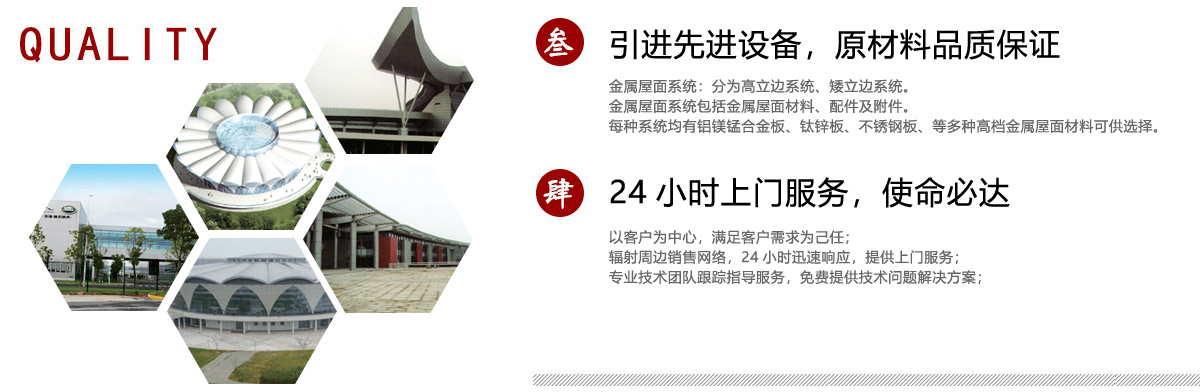 金屬屋面系統(tǒng):分為高立邊系統(tǒng)、矮立邊系統(tǒng)。金屬屋面系統(tǒng)包括金屬屋面材料、配件及附件。每種系統(tǒng)均有鋁鎂錳合金板、鈦鋅板、不銹鋼板、等多種高檔金屬屋面材料可供選擇。